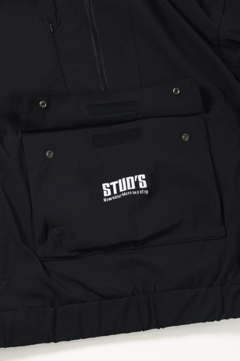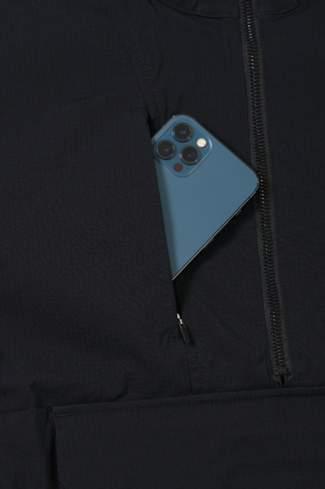 ハーフジップブルゾンだからこそ実現した抜群のインパクトと他と被らないデザイン性はもちろん、小さいサイズでも横約26㎝×縦約18㎝(S、M共通)の大きさを誇る収納力が売りです!大事なものを入れても安心感があるように面ファスナー+ボタンで留められる仕様になっています。(L以上はさらに1~2㎝ほど大きいです。)